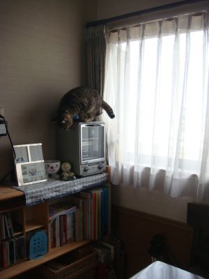 椅子から窓辺に飛び移り、カーテンを押し上げオーブントースターの上に乗り、棚の上の写真立てやカップを落とし我が物顔で歩き回り、キッチンカウンターからキッチンへ侵入・・・