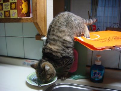 これはカウンターに後足を置いたまま、ケーキのお皿を舐めてるところね