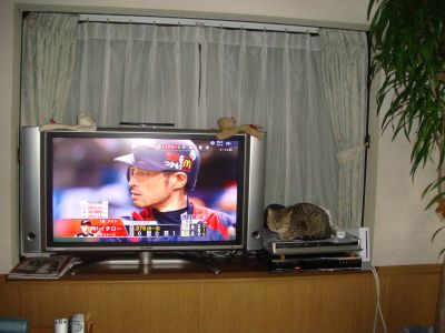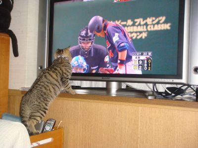 キッチンに侵入できなくなったタイシ、長男君が来てWBCを見てたら、侵入を諦めてテレビを見てたよ