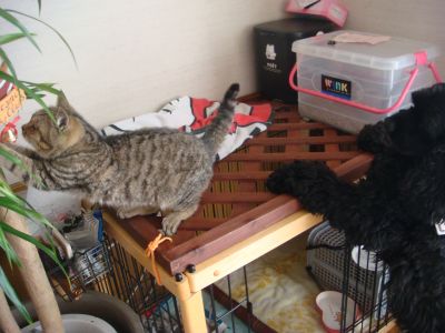 仕方なくケージに放り込むと、にゃ~にゃ~(出せ~出せ~)言いながら暴れまくり、水の中に足を突っ込んでこぼし、手を伸ばしラグをガリガリし、横の棚に置いてあった缶をひっくり返し、終いには天井に乗せたラティスの隙間から出てきちゃったよ~~~