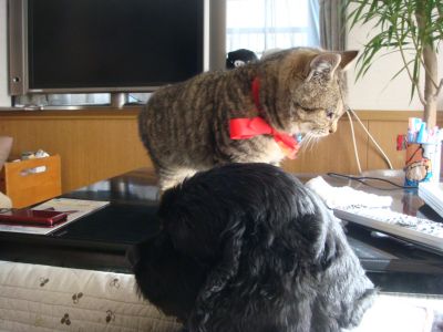ゆきちが座って見上げてるんで、にゃんこも油断できない?