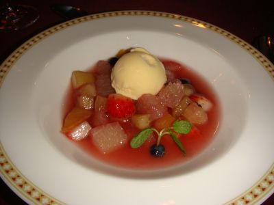 デザートはカクテルフルーツのアイスクリーム添え
