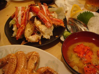 茹でた毛ガニ・たらばガニ・ズワイガニの盛り合わせに、焼きたらば、カニ汁、さんまのたたき、鮭のちゃんちゃん焼き、坊ちゃんかぼちゃと何とかからしの天ぷら、いくら丼