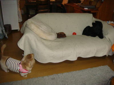 ボールの取り合いには負けるし、側に寄られるだけで恐いのか(汗)、ソファーに乗っても『ボクはいません・・・』って感じで端っこで小さくなってるし・・・(^_^;