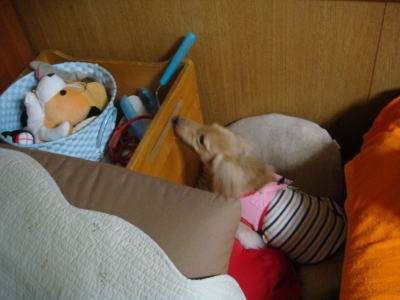 勘違い凛子は(笑)、ゆきちのおもちゃ箱にジャンプしたり、ソファーの上から顔を突っ込んだりしながら、おもちゃを散らかし放題・・・