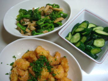 海老の天ぷら醤油炒め・ブロッコリーとエリンギのオイスターソース炒め・きゅうりの漬物