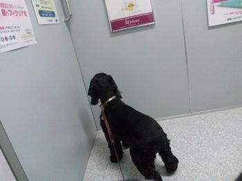 検体を持ってDrが診察室からいなくなると、ゆきちも「終わったのなら早く帰りましょ」と、診察室から出る気満々で待合室へと続くドアにピッタリ・・・