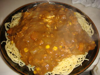 ってかね、パスタを300gも茹でるから、我が家で一番大きなお皿に盛ってるのに、パスタの横にカレーがかけられなかったみたい・・・