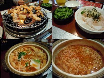 焼き肉(カルビ・セセリ・ホルモン・とり皮)、枝豆、大根サラダ、赤から鍋それに〆のラーメン