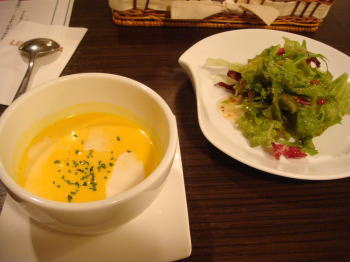 最初はパンプキンスープとサラダ