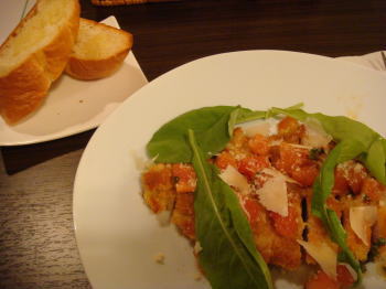 メインは豚のカツにトマトと削りチーズと粉チーズをかけたもの