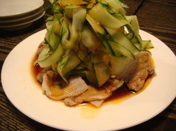 茹でた豚肉の上には、山盛りのオニオンスライスと、キュウリのスライスがたっぷり乗っかった一品