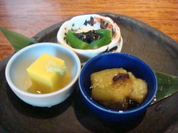 なんか豆腐みたいなのと、オクラの岩のりのせみたいなのと、焼き茄子?煮浸し???