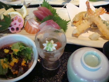 サラダ、茶碗蒸し、お刺身、天ぷら、焼き魚、卵焼き、ご飯、おみそ汁、お漬物、スイカのゼリー也