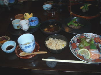 メニュー内容は、膳菜五点盛り、お造り三種盛り、牛肉のグリル韓国ソース、枝豆の冷製豆腐、もろこし炊き込み御飯、香の物、汁物、デザートになっておりましたぁ♪