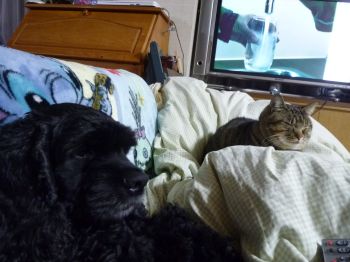 ゆきちもソファーが好きだから、ゆきちの横で遠慮しながら小さくなってテレビを見ていると、どこからともなくたいしがやってきて、わざわざあたしの上に乗ってくるんだよねぇ・・・