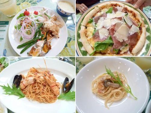 サラダバーとドリンクバーだけのオーダーは980円って書いてあったから、パスタ2つとピザ2つ、それにサラダバーとドリンクバーを2つオーダーして、6人で分けることにしてみた♪