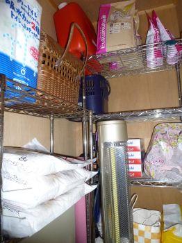 今まで洗面台と洗濯機の横のスペースに、87×60×25㎝のスチール棚を置いて、ストックの洗剤や柔軟剤も置いてたんだけど、たいしが来てからはストックの洗剤等を噛みちぎって洗面所を海にしちゃうってコトで、今じゃストックは扉の中で保管してるのね