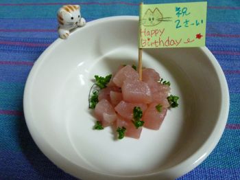 10日前のいちごちゃんの誕生日の時、ももままがマグロでケーキみたくしてたから、ちょっと真似っこして、たいしには『マグロのお子様ランチ風』にしてみたよ~v(*^^*)v