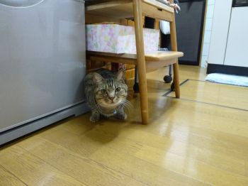 いつも一瞬の隙をついてキッチンに侵入し、椅子の下に隠れてるんだよね・・・