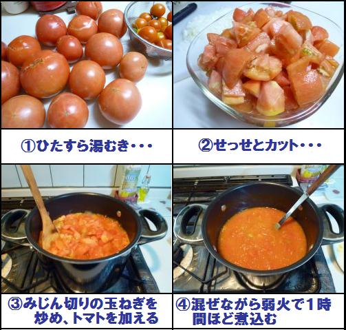 「今朝20コくらい取れたけど、みんなひび割れちゃってるしどうしよう」って電話があったから、「トマト煮をするから大丈夫♪」ってコトで、せっせとトマトを煮てたのよ~~~ヽ(-^.^-)ノ