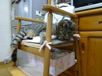 せっせと夕食作りに励んでいたら、たいしったらわざわざキッチンの狭い椅子の上で寝てるし~(^_^;