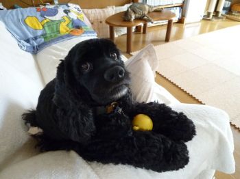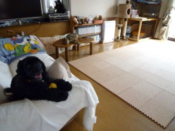 折角だからコルクマットの良さを体験してもらおうと、ボールを投げてみたけどボールを取ったら即ソファーへ・・・