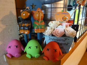 結婚25周年のお祝いに、紙粘土でバラ(写真右)を作ってくれたから、その余った粘土で、バリ猫ちゃん(写真左の椅子に座ってる猫)の魚を作ってってお願いしてあるんだけどなぁ・・・