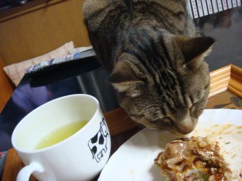 ひとりでテレビを見ながらお好み焼きを食べていたら、たいしが真ん前で狙うのよ~~~~(>_<)