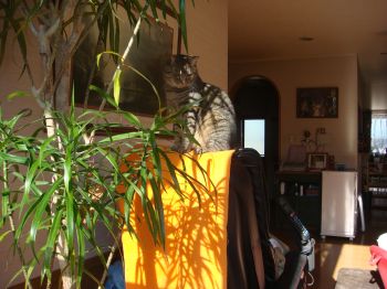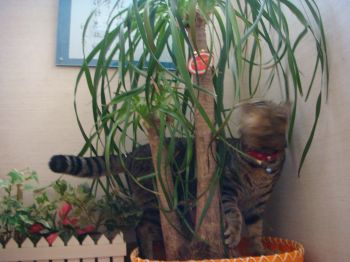 階段に避難してもらってるけど、たいしがすぐに葉っぱに飛びついて遊ぶんだよねぇ・・・