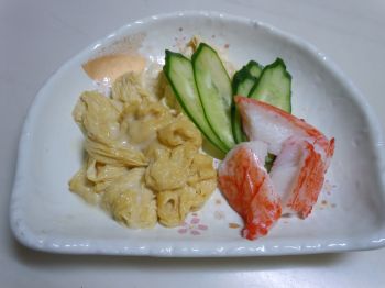 今日の夕食は、ちらし寿司・お吸い物・湯葉とアボカドのお刺身の予定だったけど、悲しいかなアボカドがまだ固かったから、キュウリとカニカマに急きょ変更・・・