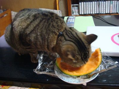 先日もメロンを食べながらテレビを見ていたら、食べ終わった皮についてるメロンを舐めまくってるし・・・(;^_^A