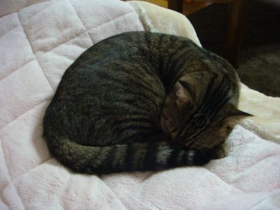 ゆきちさん、クッションの上で丸まってます