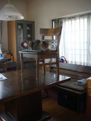 テーブルの上に乗せた椅子の上に乗ってるよ~!?