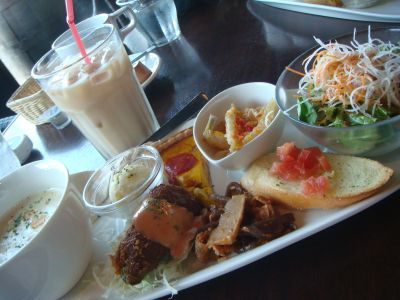 プレートの上には、クラムチャウダー・ポテトサラダ・ピーマンの肉詰め・キッシュ・きんぴらみたいなの・マリネ・パン・野菜サラダが乗ってたけど、このピーマンの肉詰めがねぇ・・・