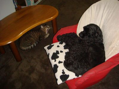ゆきちはクッションの上で寝て、たいしは何故かテーブルの下