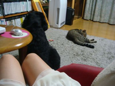 そして再びリビングに戻り、あたしがテレビを見ていると、あたしの足にピッタリ寄り添って、お尻も床にくっついてます