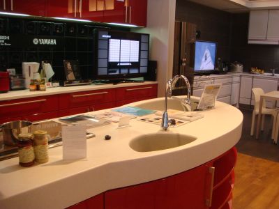 後ろには前出の真っ赤なYAMAHAのシステムキッチンだし、お茶なんてしてる場合じゃないと、見惚れていたら、ショールームのお姉さん(何て言うんだろ?)が来て、色々説明をしてくれた