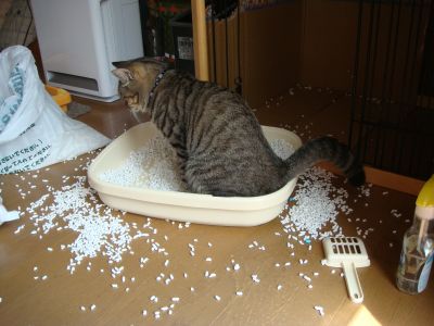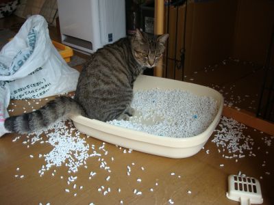 砂を全とっかえしようと、古い汚れた砂をゴミ袋に捨て、除菌消臭剤を振りかけトイレを掃除したら、新しい砂を半分だけ入れ、蓋(カバー)をしてからケージに入れ、それから残りの砂を入れようと思ってたのね
