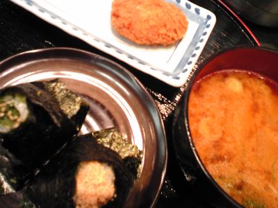テイクアウトのおにぎり屋さんで、野沢菜と焼きたらこのおにぎり、それに豚汁と海老コロッケを買って、店内で食べてきたよ~♪