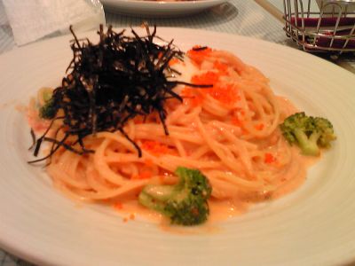 たらこクリームパスタの温泉卵のせ