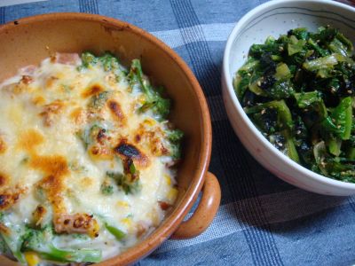 ㊨レタスの一種なんだけど、ちょっと芯が固くてサラダには向かないんで、ササッと茹でて、ゴマと焼き海苔をたっぷり入れておひたしを作ってみた