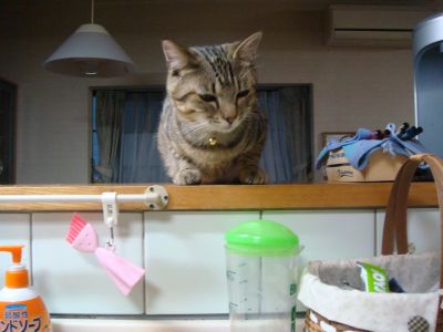 忙しいからついつ踏んづけちゃったり蹴ったりしちゃうから、キッチンから追い出すんだけど、何度追い出してもカウンターにジャンプして、何か食べるものはないかと虎視眈々と狙ってるんですけどぉ・・・(><;)!!