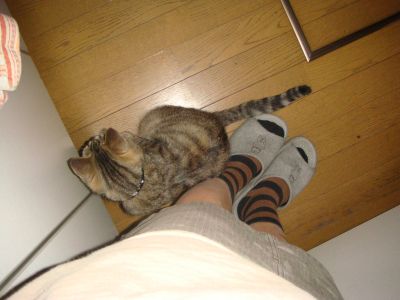 あたしが換気扇の下でタバコを吸ってると、いつの間にかたいしがやって来て、足をペロペロしたり、スカートに顔を突っ込んできたり(多分スリット部分に飛びついてるんだと思う)、はたまたスカートに飛びついたりしてくるのよ~~~(スカートの後の紐に飛びついてる模様)