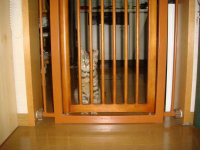 キッチンの柵を開けろとアピールしてんだよね・・・