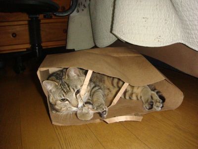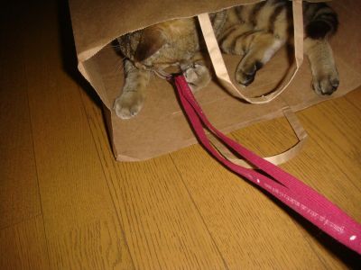 紙袋の取っ手部分がちょうどいいおもちゃになるらしく、中に入って取っ手を噛んだり、出たり入ったりしながら喜んで遊んでたよ